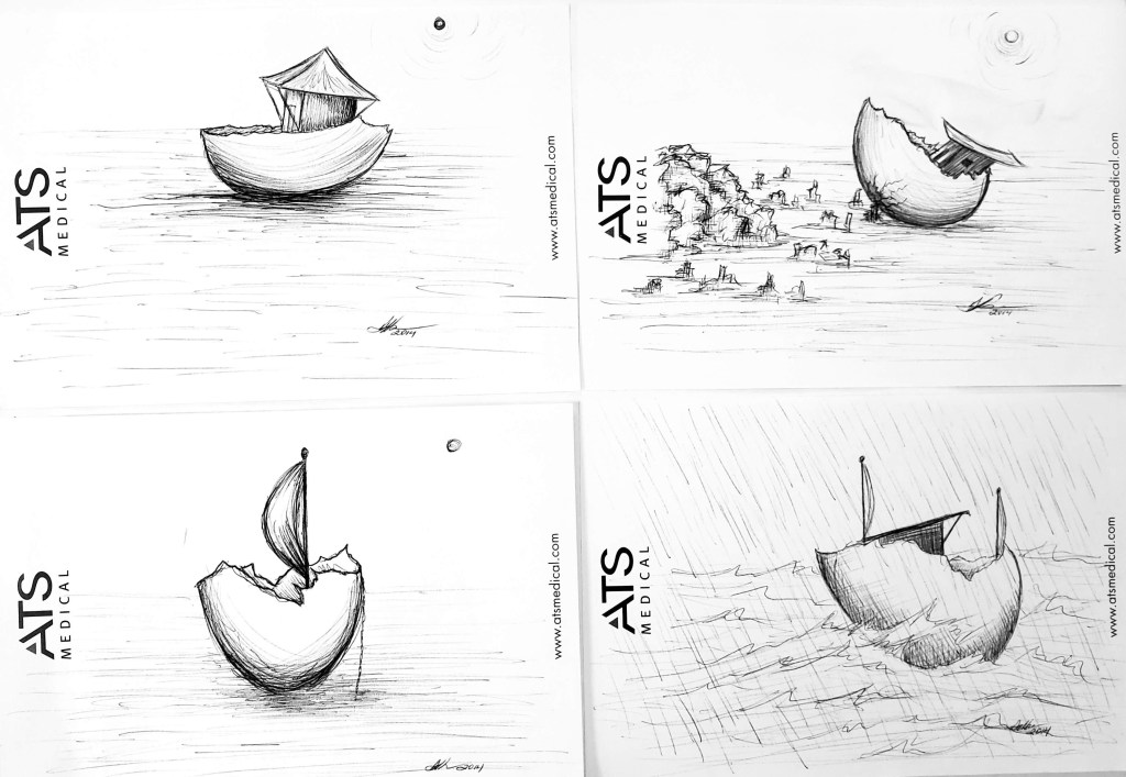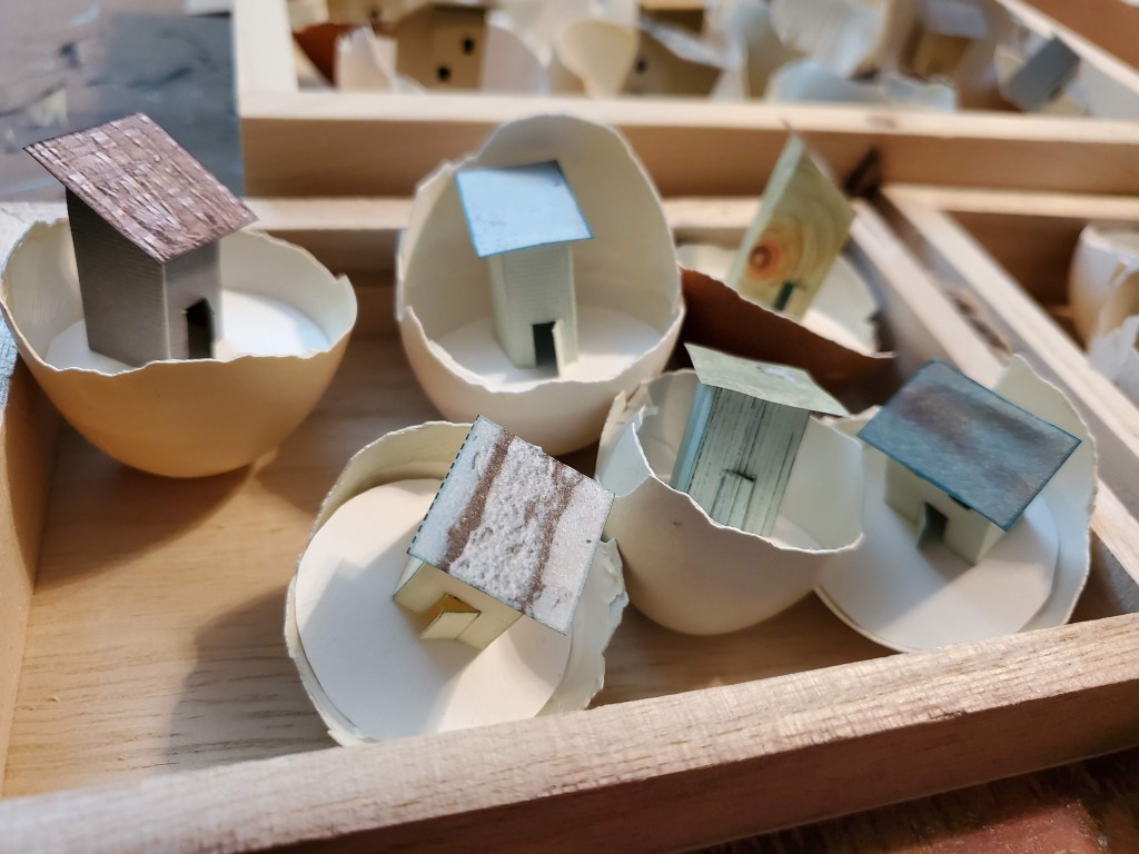 Born out of that boredom were some of the concepts that I’m still exploring today, 8 years later. One of those concepts are my Egg Boats. I did sketches, based on an image in my head, of eggs with little houses in them floating in water. But, eggs are fragile, delicate, and can break if hit or knocked just the right way. They’re also resilient. They hold the most precious matter inside of them, protecting that matter from a harsh, external environment until it’s time to come out and experience all that the world has to offer.