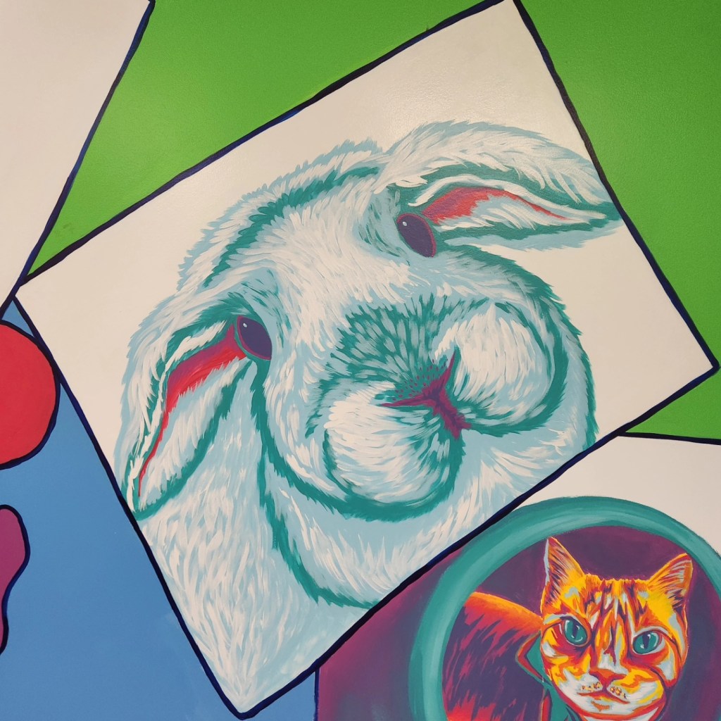 This mural is located in the cat enclosure area at the shelter. Shelter and pet enthusiasts were able to purchase a place for their pet to live on in the mural, with proceeds split between the shelter and the artist. Located in Cheyenne, WY.