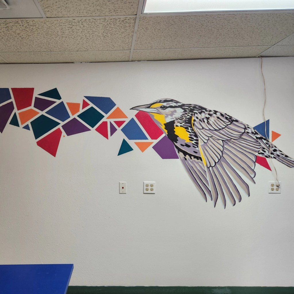 This mural, featuring a Western Meadowlark, was painted for the Cheyenne Creativity Center which is a local art center. This mural was done in support of the Center to help add color and vibrancy to the workshop area. Located in Cheyenne, WY.